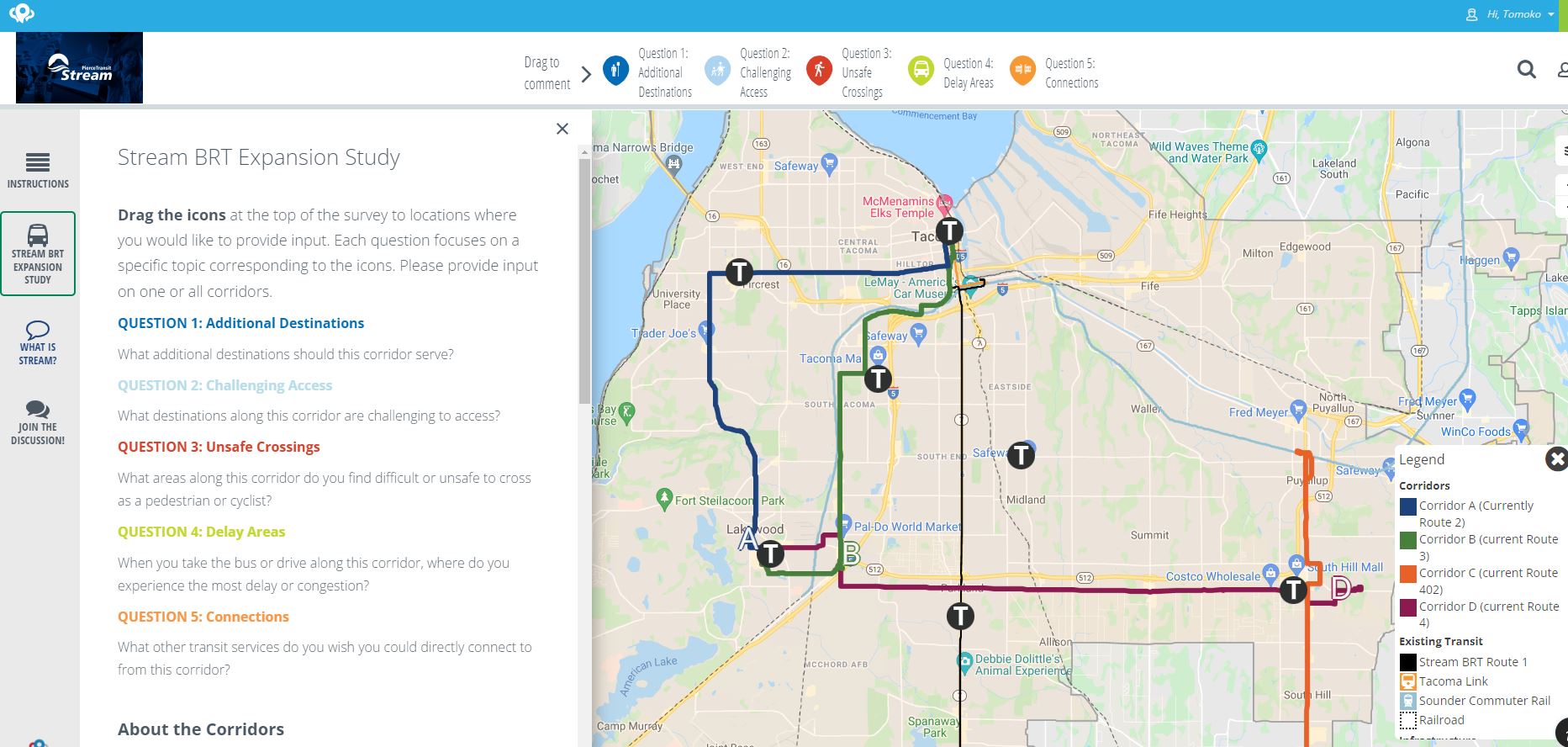 Pierce Transit is in the process of identifying the next corridor for investment in Bus Rapid Transit (BRT). The Stream BRT System Expansion Study is analyzing four potential corridors to determine which one is the best option for our second Stream BRT line. The four corridors under consideration were chosen because they: